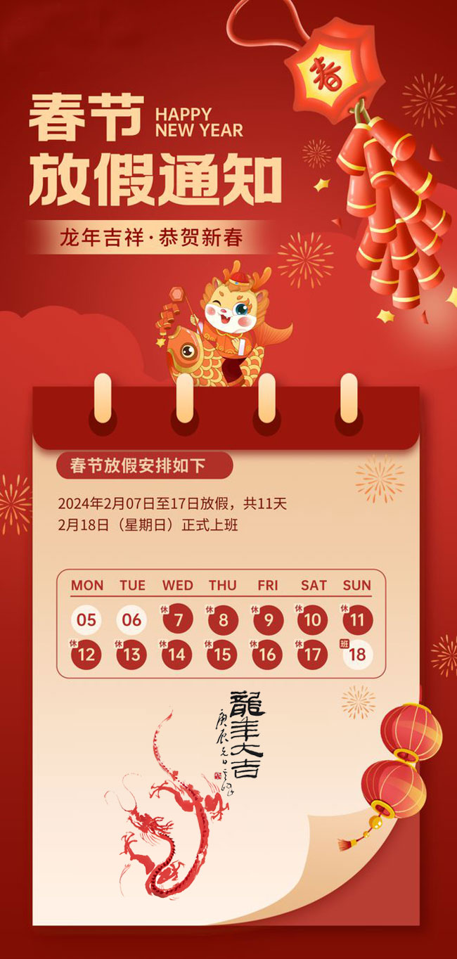 具體放假時(shí)間為:2024年2月7日-2月17日放假,共11天,2月18日(星期天)正式上班。放假期間網(wǎng)站問(wèn)題電話或微信反饋,我們第一時(shí)間處理,電話:15399213588(同微信)